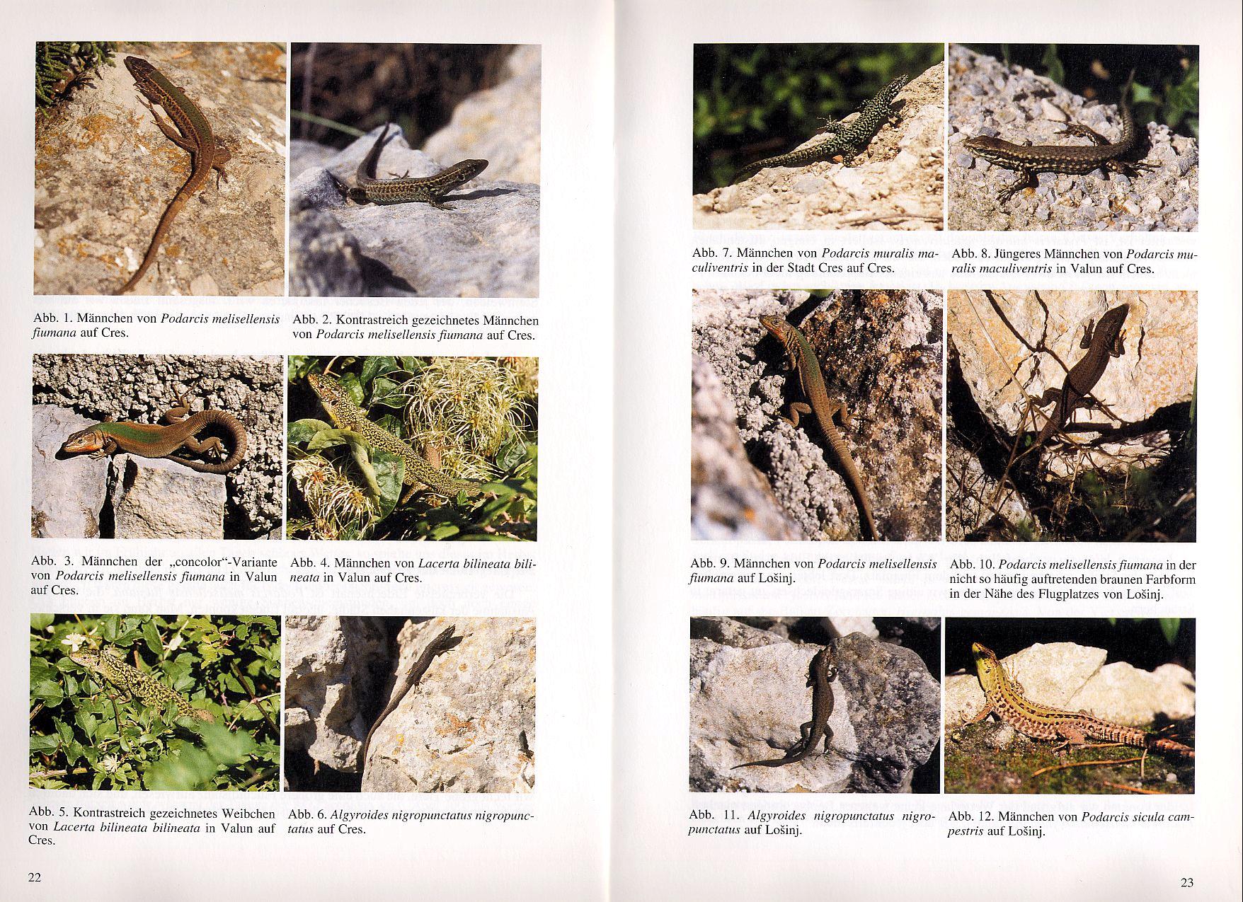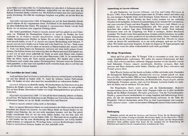 In Heft 1/2004 der Eidechse findet sich auf den Seiten 20-26 ein Beitrag von Martin Dieckmann mit dem Titel "Die Lacertiden der Kvarner Inseln Cres und Losinj / Kroatien". Der Artikel widmet sich in einer wissenschaftlichen Betrachtungsweise den Eidechsenvorkommen auf Cres und Losinj. Dabei werden sowohl Vorkommen als auch Aussehen (Färbung und Zeichnung) und Verhalten der Tiere beschrieben und analysiert. Auf den Seiten 22-23 finden sich Bilder der beobachteten Eidechsen mit entsprechender Beschreibung. Alle Texte und Bilder des Artikels unterliegen dem Urheberrecht des Autors Martin Dieckmann |