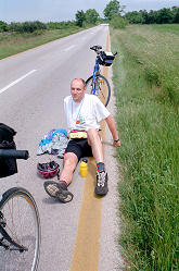 Das man bei der Fahrt durch derart schöne Landschaften auch mal ins Träumen kommt ist verständlich. Und so begab es sich, daß nach einem kleinen Moment der Unachtsamkeit, aufgrund teuflich zupackender V-Brakes und eines griffigen Straßenbelages Achim den Gesetzen der Physik, namentlich der Trägheit und anschließend der Schwerkraft, den Sattel seines Rades verließ um sich im Tiefflug über den Lenker der Straße zu nähern, wo er dann schließlich zu Fall kam. Glücklicherweise wurden keine weiteren Radler in den Sturz verwickelt, die anschließende Untersuchung ergab außer ein paar Prellungen keine schwerwiegenden Schäden und Achim setzte die Tour im "Lumpensammler", einem Notbus der die Tour begleitete und schwächelnde Radler mitnahm, fort. |