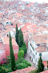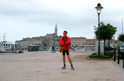| Diesmal hatten die Veranstalter einen Platz im Hafen als Parkfläche für die Radler abgesperrt. Wo bekommt man so etwas noch geboten, Parkplatz direkt im Centrum am Hafen, die nächsten Restaurants nur wenige Meter entfernt und wer sich Zeit nahm Rovinj zu erkunden, den erwartete fantastisches. So z.B. auf der Spitze der Halbinsel die mächtige Domkirche Sv. Eufemja, die ab 1736 anstelle von zwei älteren Kirchbauten entstanden ist. Überragt wird die dreischiffige Barockkirche von ihrem schlanken, 60 m hohen Campanile, der höchste in Istrien, mit der Statue der hl.Euphemia an der Spitze. Vorbild für diesen Glockenturm war, wie könnte es anders sein, der Glockenturm von Venedig. Und das allerwichtigste an diesem Glockenturm, hat man die vielen maroden Stufen und die Angst davor erst einmal überwunden, bietet sich einem ein phantastsicher Ausblick über Rovinj. | |